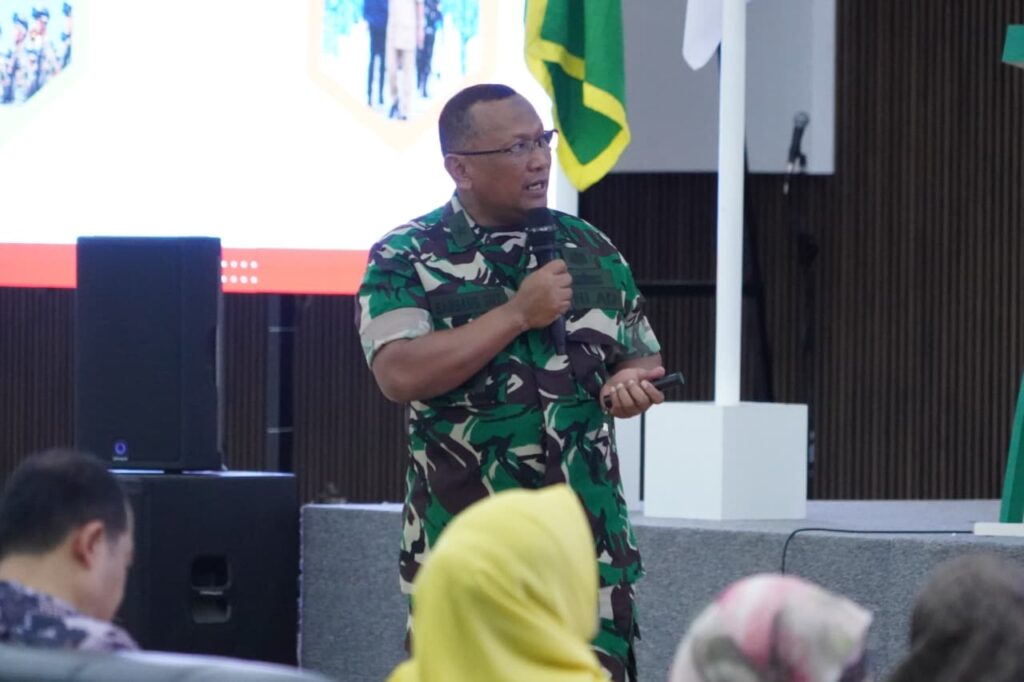 Banda Aceh – Kepala Kelompok Staf Ahli (Kapoksahli) Pangdam Iskandar Muda, Brigjen TNI Bambang Sulistyo Hery, S.Sos., M.Han., menghadiri kegiatan Pengenalan Kehidupan Kampus bagi Mahasiswa Baru (PKKMB) Universitas Abulyatama sekaligus memberikan pembekalan materi Bela Negara kepada 870 mahasiswa baru Universitas Abulyatama. Kegiatan tersebut berlangsung di Gedung Serbaguna Nyak Syeh, Selasa (07/10/2025).
