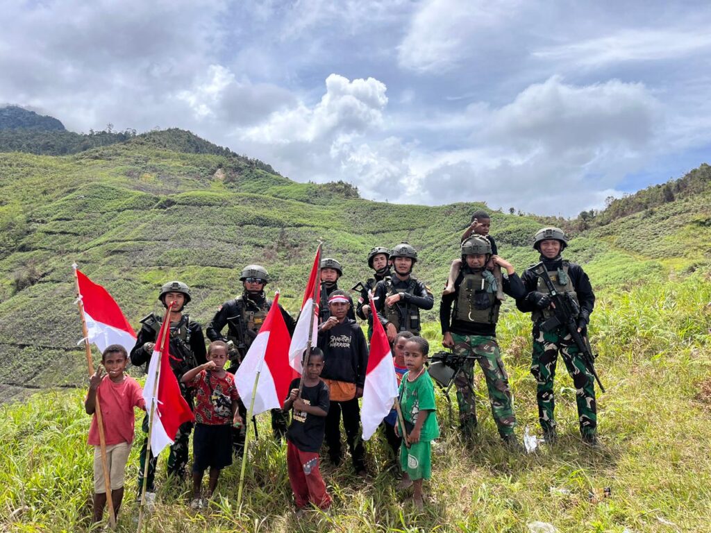 Papua Tengah – Suasana haru dan penuh semangat kebangsaan dalam rangka menyambut Hari Juang Kartika TNI Angkatan Darat Tahun 2025, Pos KP 55 Satgas Yonif 112/DJ bersama anak-anak Papua mengibarkan Bendera Merah Putih di pohon satu kampung kalian banak Distrik Mulia Kab. Puncak Jaya Prov. Papua Tengah, Senin (15/12/2025).