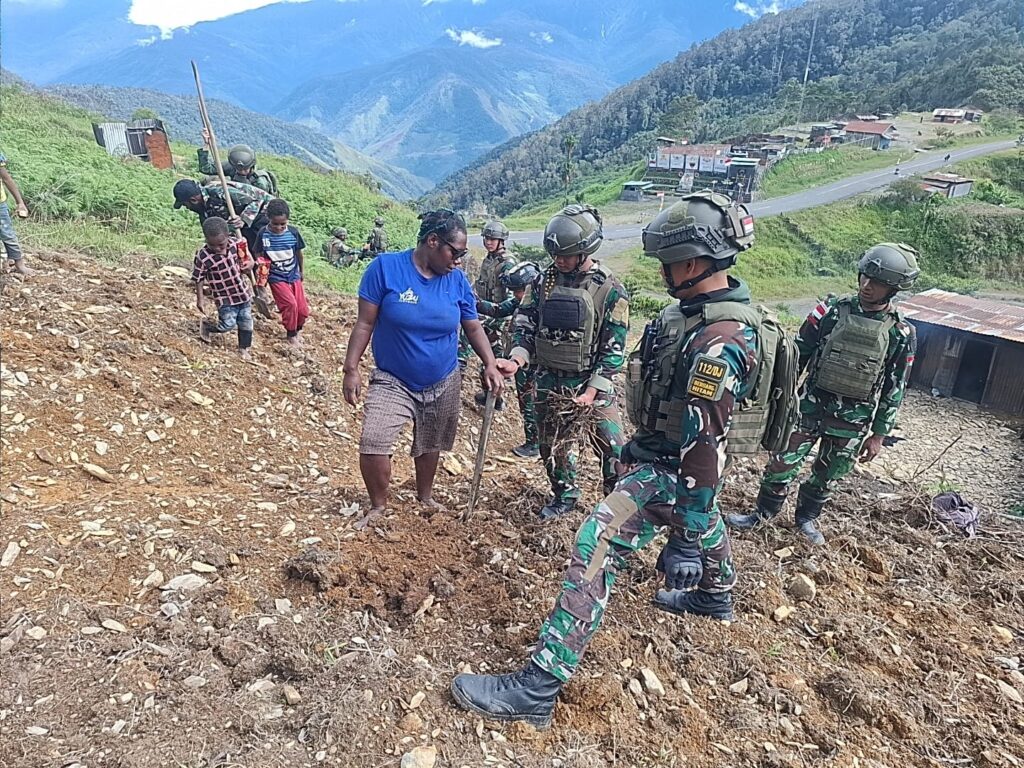 Papua Tengah – Satgas Yonif 112/DJ Pos Puncak Senyum Berbagi Ceria dan Mengedukasi Ketahanan Pangan kepada Masyarakat di Kampung Yarmukum Distrik Tinggi Nambut Kabupaten Puncak Jaya Provinsi Papua Tengah, Selasa (11/11/2025).